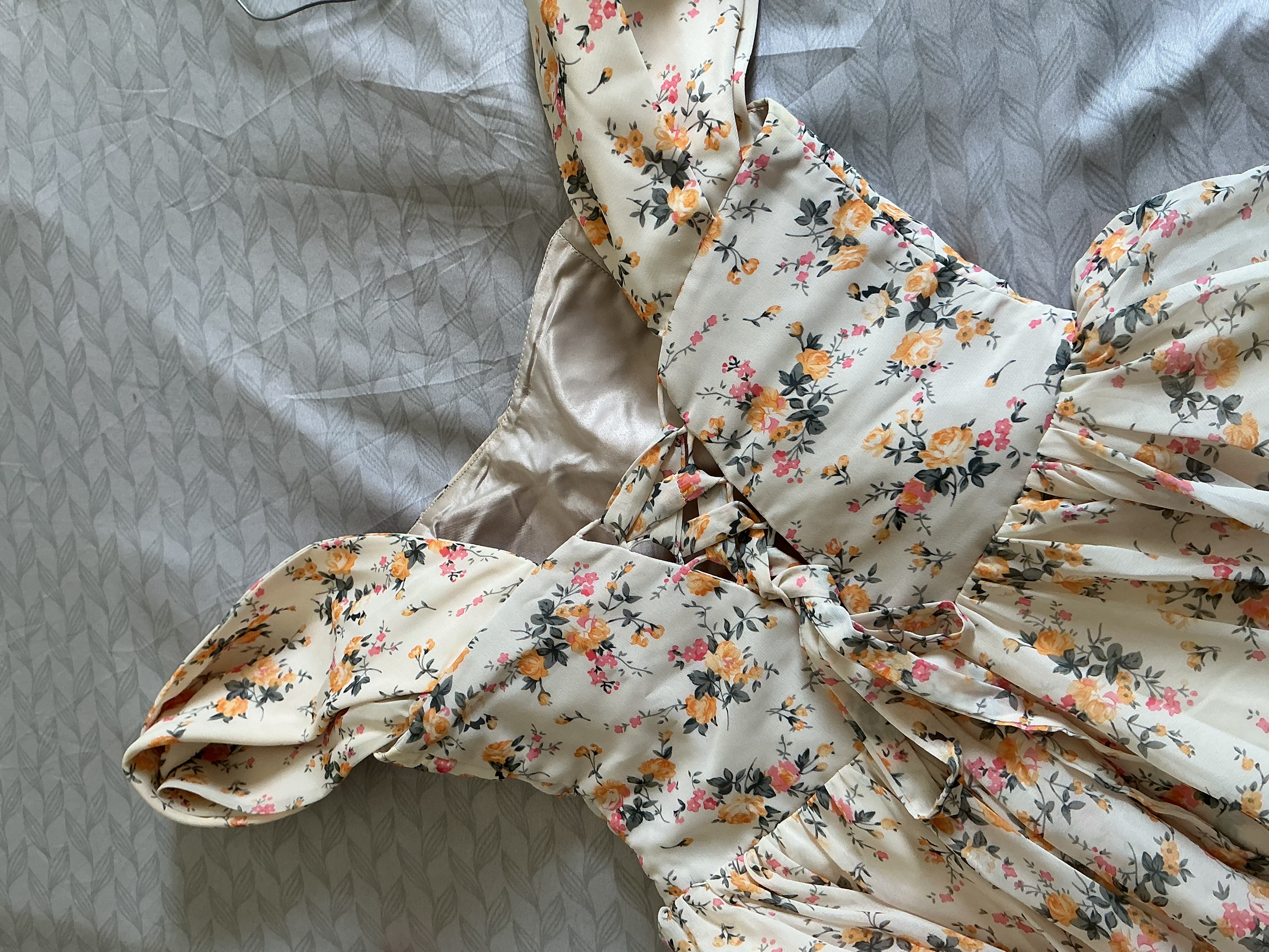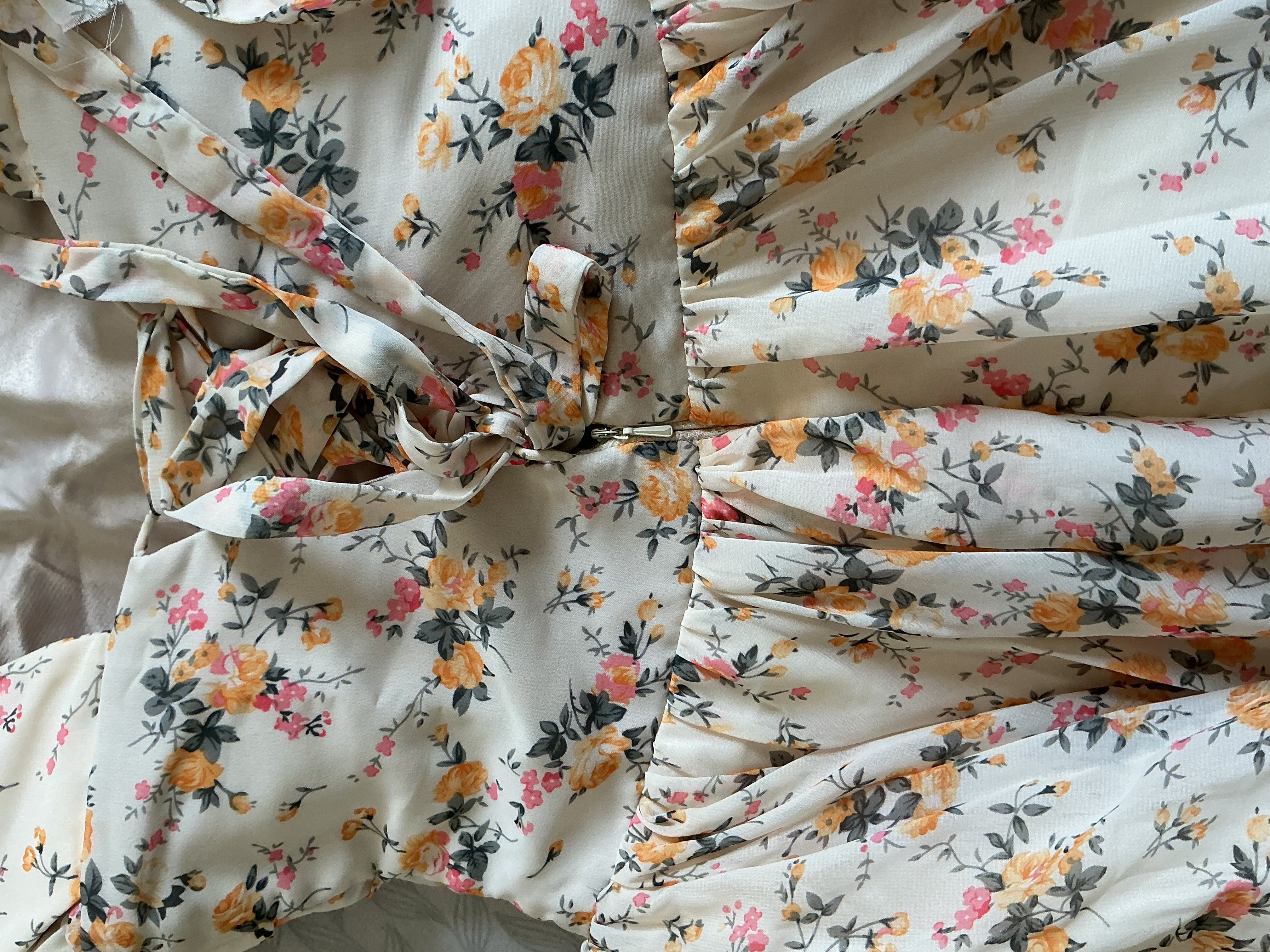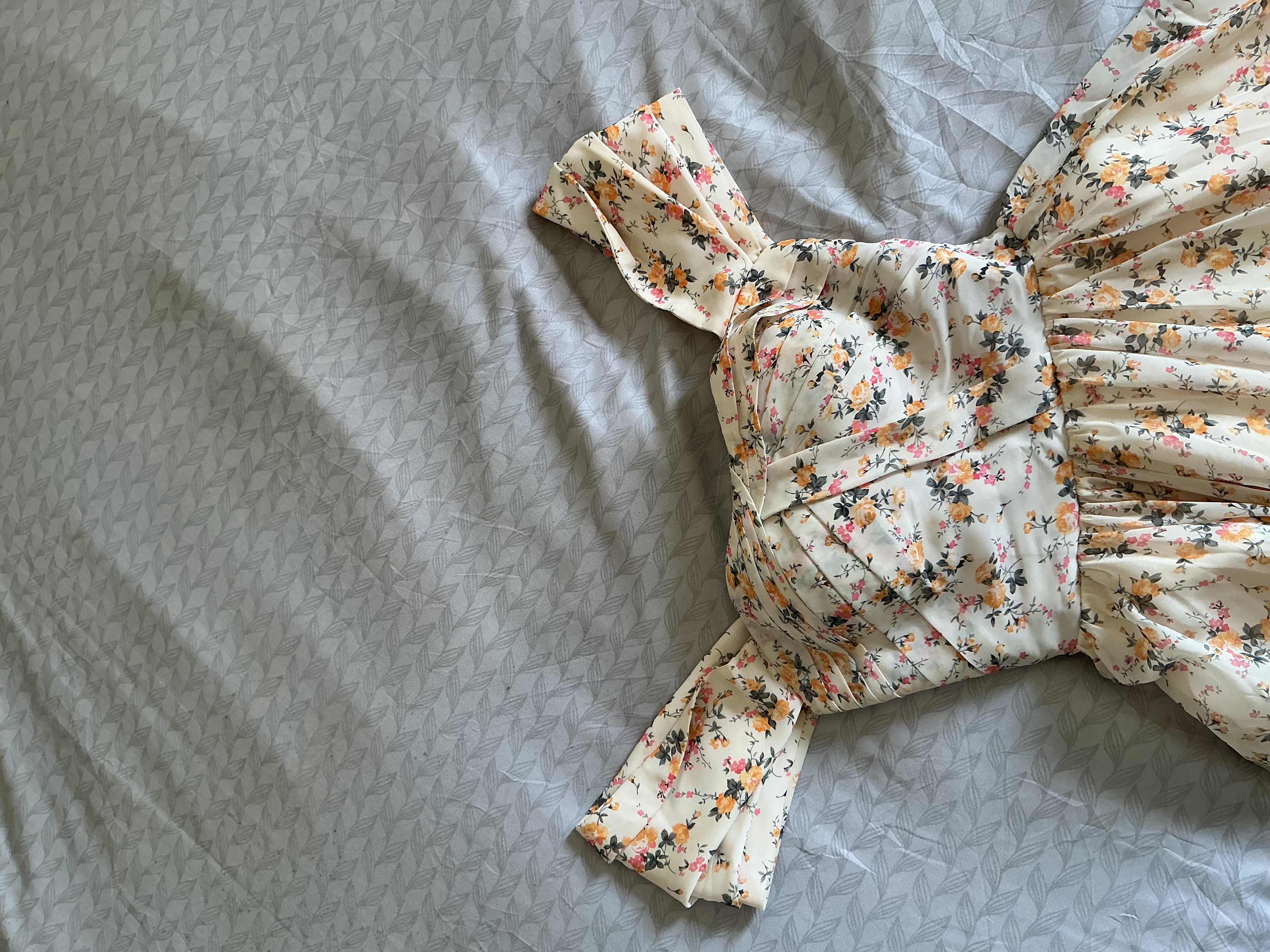 التصميم العام والقصة • الستايل: الفستان ينتمي لستايل "البروم" (Prom) أو فساتين الخمسينيات الكلاسيكية، مع تنورة واسعة (Full Circle Skirt). • الصدر (Bodice): يتميز الصدر بتصميم "الدرابيه" (Draped) أو الثنيات المتداخلة التي تعطي حجماً وتفاصيل فنية راقية. • الأكتاف: تصميم أوف شولدر (Off-the-shoulder) مع أكمام قصيرة ومنسدلة تأتي على شكل طيات عريضة، مما يبرز منطقة الرقبة والأكتاف بشكل جمالي. 2. النقشة والألوان • النقشة: "فلورال" (Floral) عبارة عن ورود صغيرة ناعمة موزعة على كامل القماش. • الألوان: قاعدة الفستان باللون السكري (Off-white) أو الكريمي، مع ورود بألوان دافئة مثل الأصفر الخردلي، الوردي الخافت، والأوراق باللون الرمادي أو الزيتي الداكن. هذه التوليفة تعطي انطباعاً "ريفياً" ناعماً (Cottagecore). 3. التفاصيل الخلفية (الظهر) • الرباط (Lace-up): الظهر يحتوي على نظام مشد (Corset style) مع أربطة من نفس نوع القماش، وهذا يساعد في ضبط قياس الفستان تماماً على الجسم وإبراز الخصر. • السحاب: يوجد سحاب خلفي مخفي يبدأ من تحت الرباط لسهولة الارتداء. 4. القماش والتبطين • القماش الخارجي: يبدو من الصور أنه قماش الشيفون الناعم أو "الكريب جورتيت"، وهو قماش خفيف يسمح بحركة التنورة بشكل انسيابي. • البطانة: الفستان مبطن بالكامل من الداخل (كما يظهر في صورة الظهر) بقماش ساتان ناعم بلون بيج/ذهبي فاتح، مما يضمن عدم شفافية القماش ويحافظ على هيكل الفستان.مقاس (s,m)السعر 400